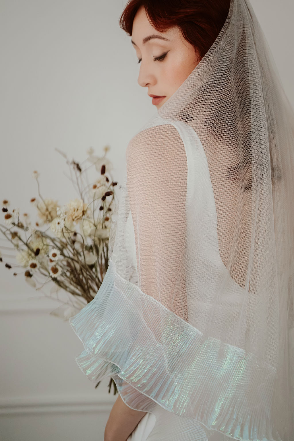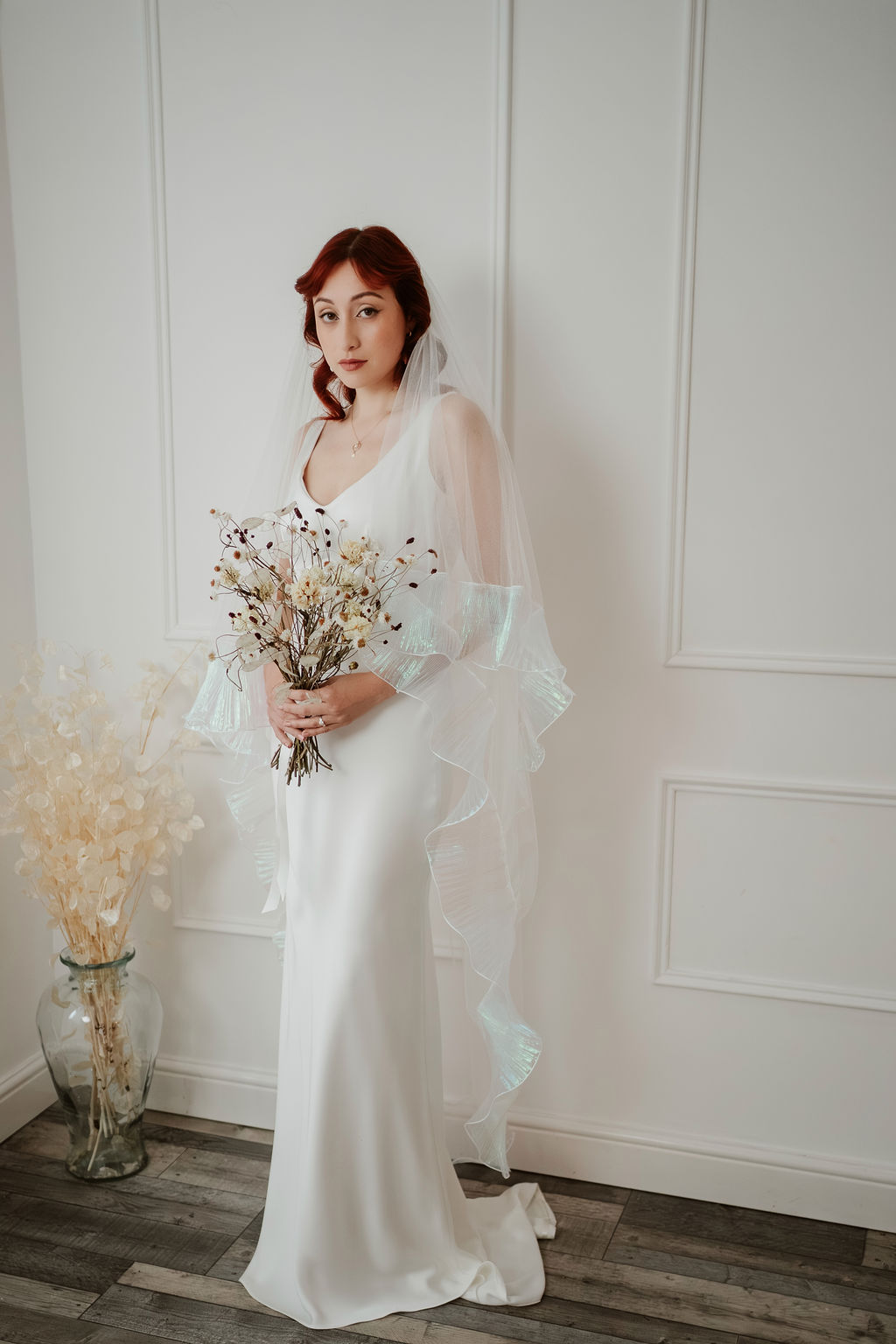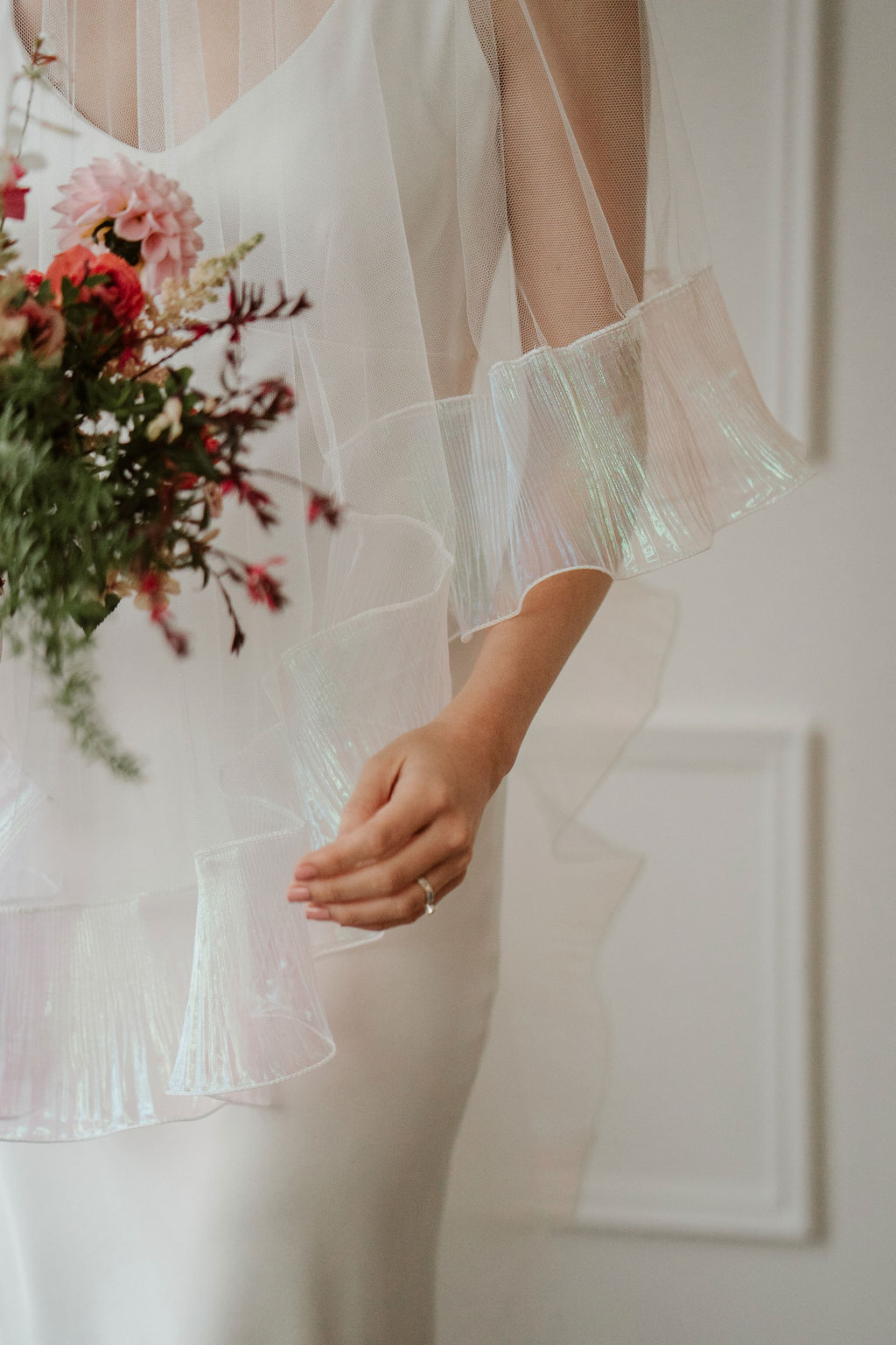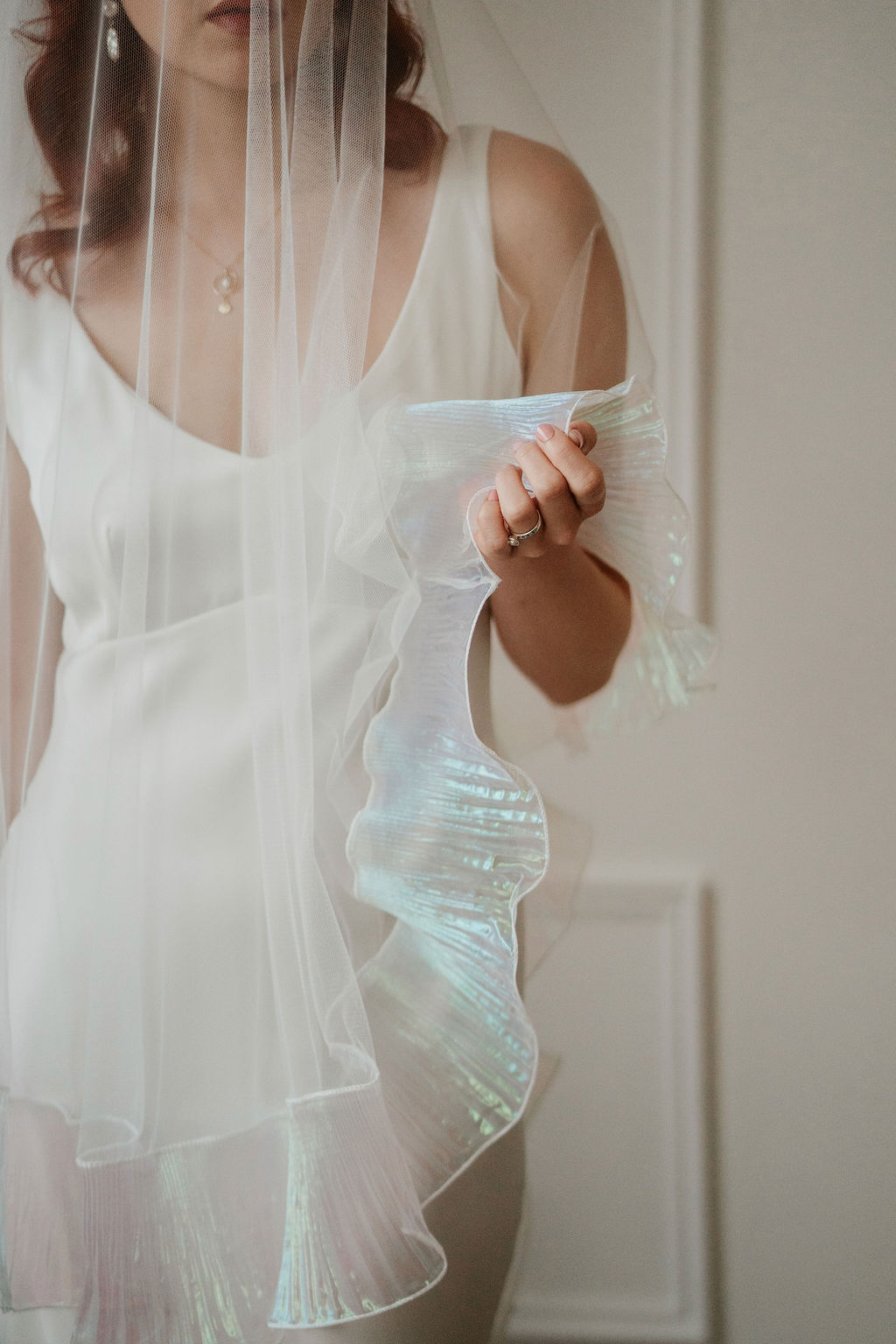 The Odette’s signature ruffle trim is crafted from a luminous, pearlescent fabric that catches the light beautifully. Soft opal tones - subtle hints of icy blue, blush, and lavender - appear as the veil moves, creating a gentle iridescence that feels modern and ethereal. This shimmering finish adds depth and dimension while remaining refined and understated.
