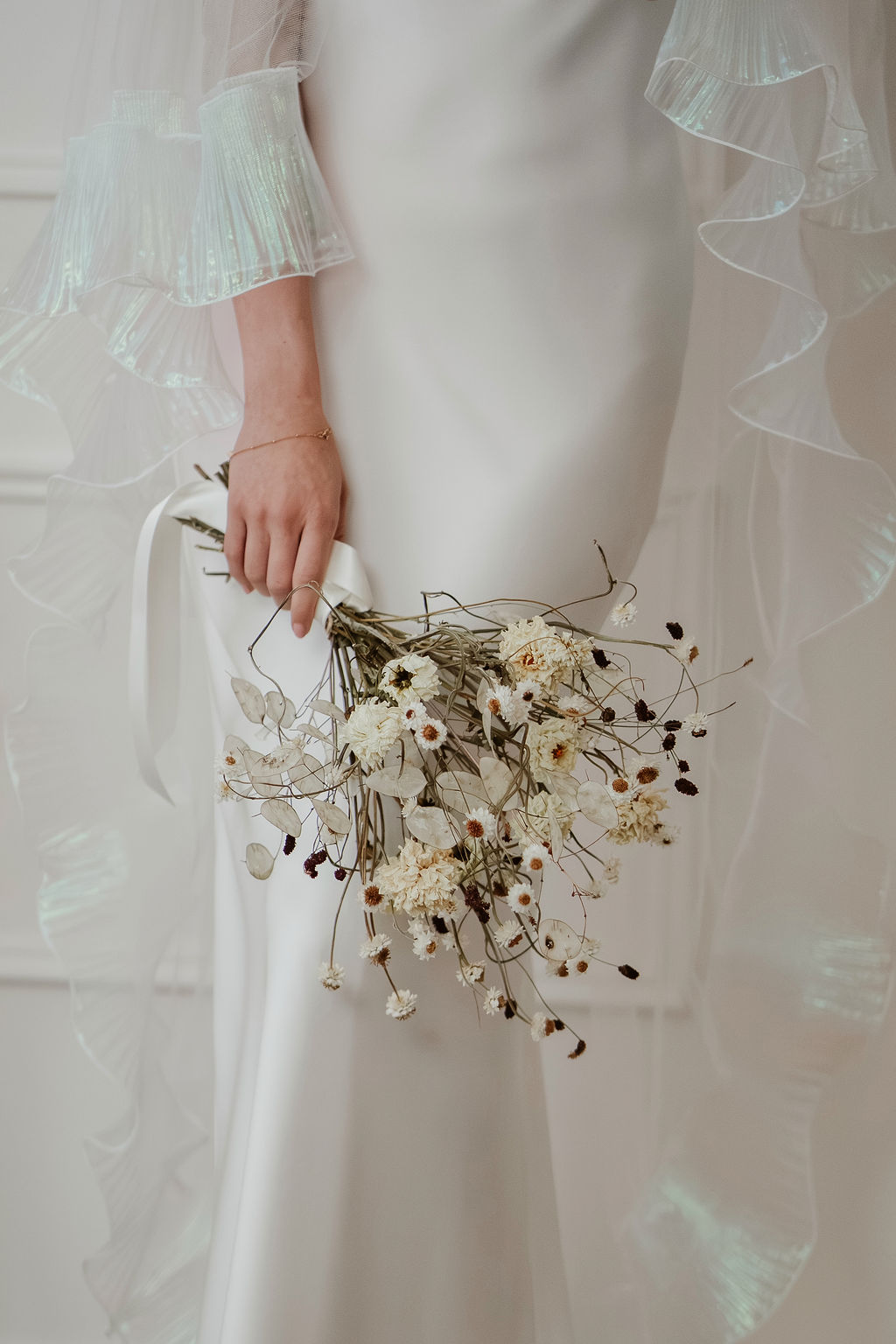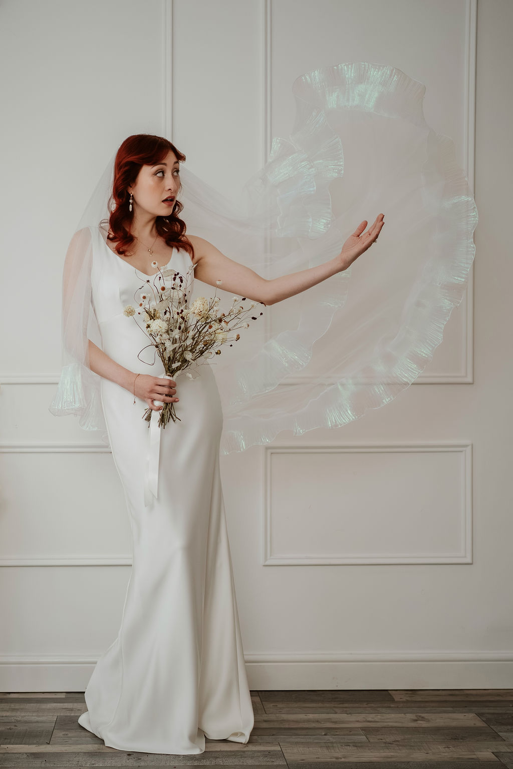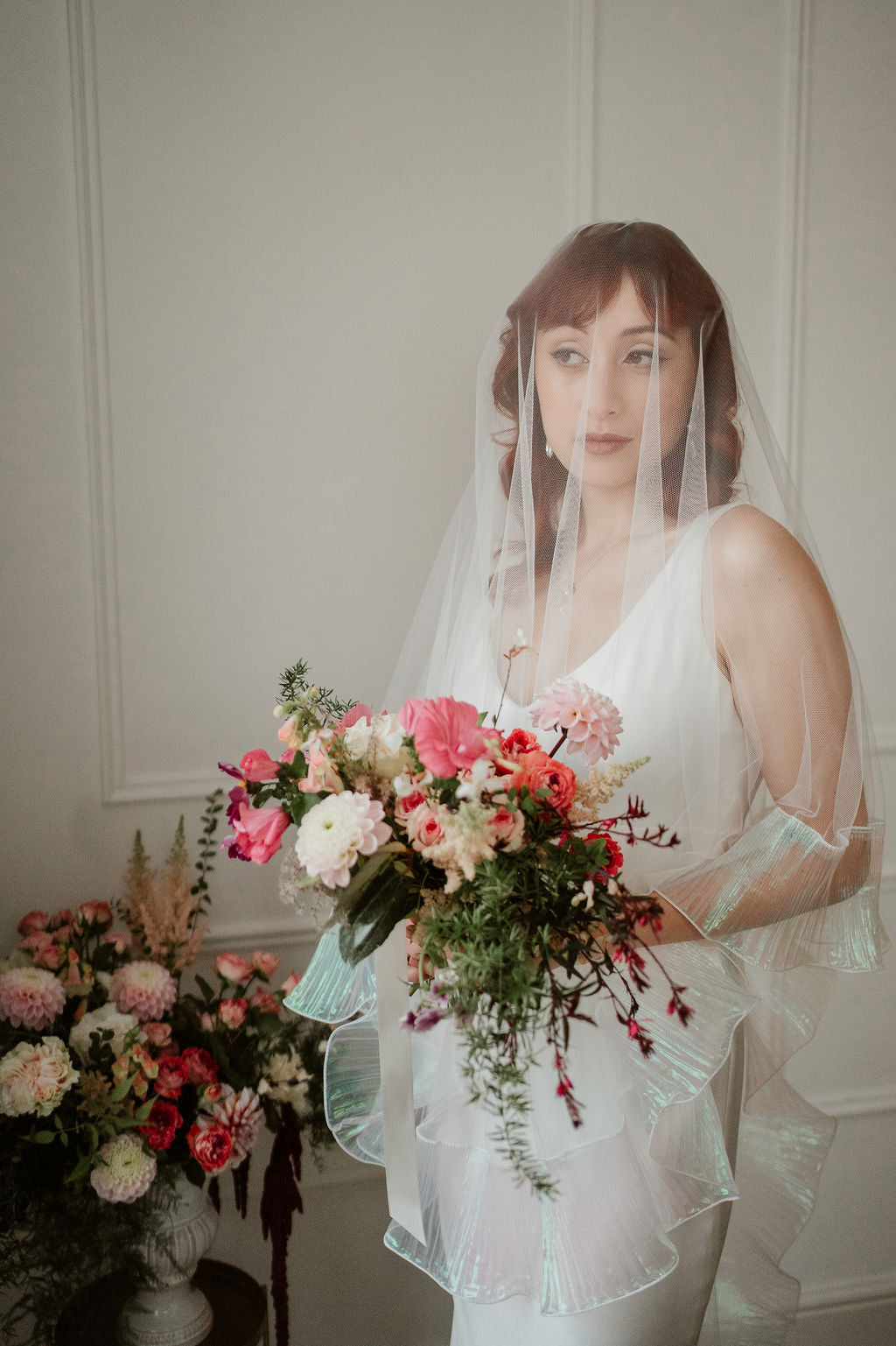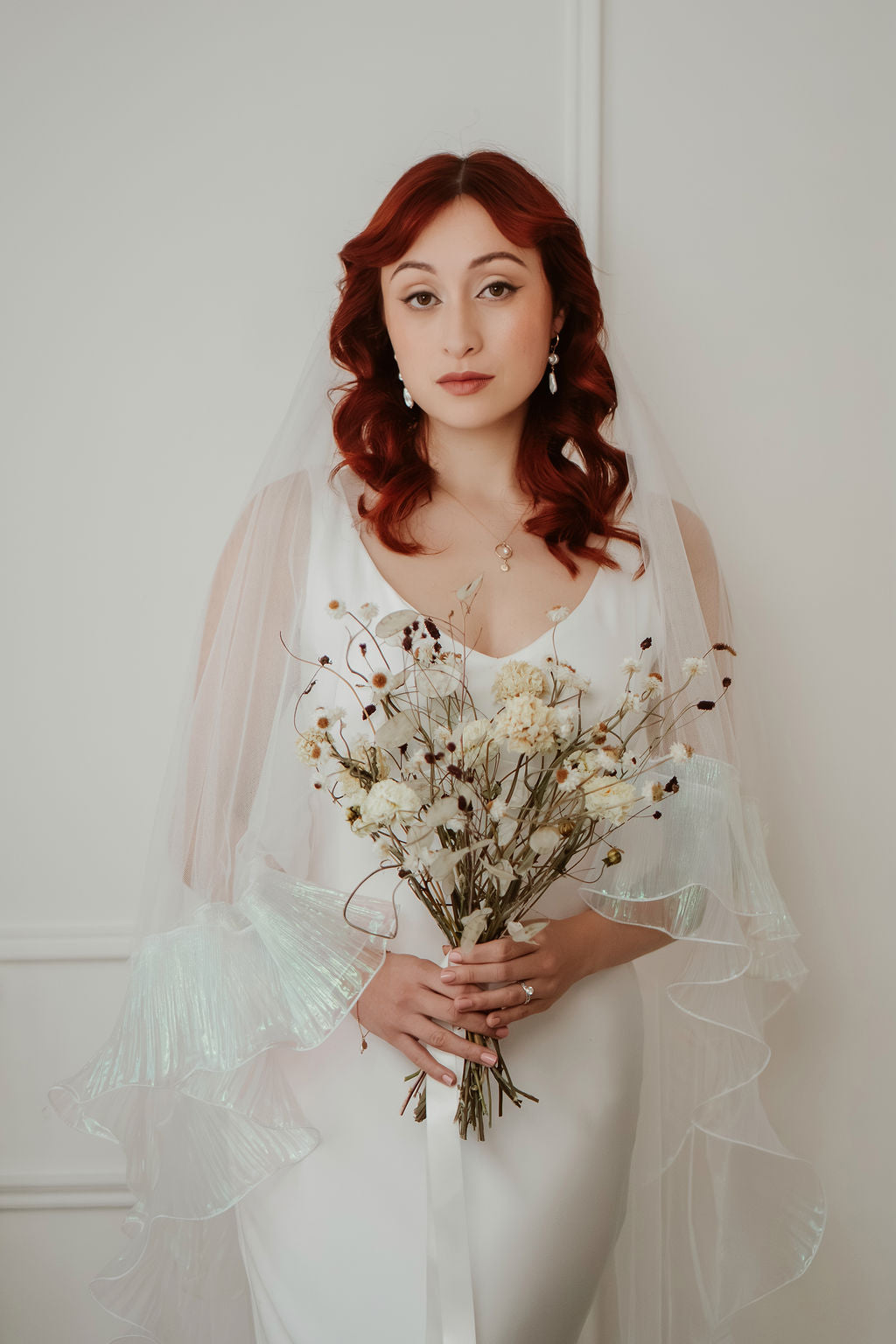 The Odette’s signature ruffle trim is crafted from a luminous, pearlescent fabric that catches the light beautifully. Soft opal tones - subtle hints of icy blue, blush, and lavender - appear as the veil moves, creating a gentle iridescence that feels modern and ethereal. This shimmering finish adds depth and dimension while remaining refined and understated.